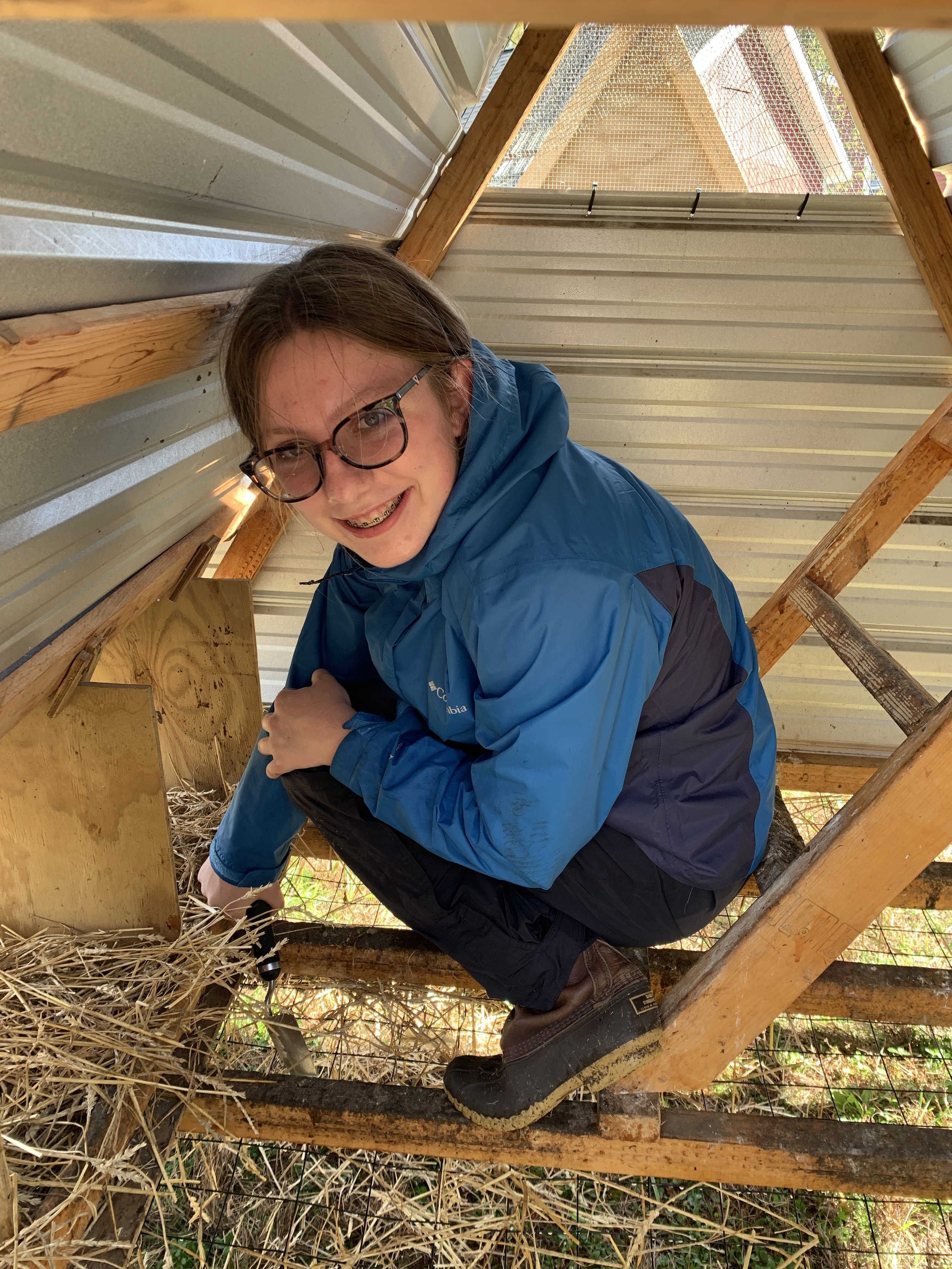 Helen Saunders in the AP’s portable chicken coop